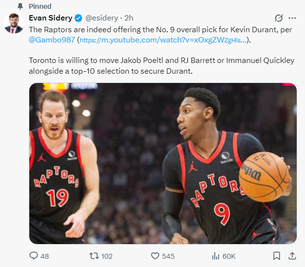 多伦多猛龙队报价杜兰特的筹码也已经出炉,埃文-斯迪瑞透露是打包RJ-巴雷特+2025年9号签、珀尔特尔、奎克利,这个交易的筹码说实话已经很不错,但太阳好似依旧无动于衷。