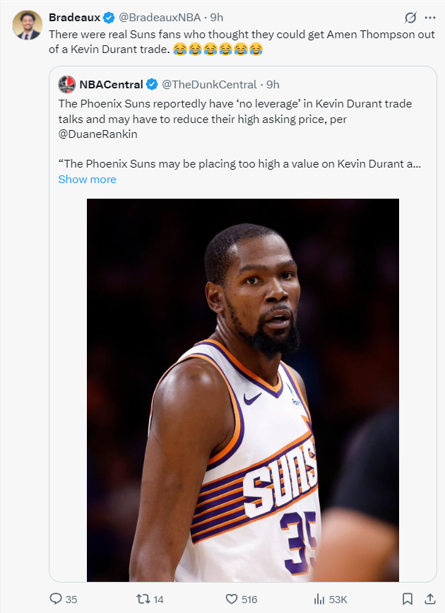 他还转发马克-斯坦恩对杜兰特的评价:太阳管理层对36岁老将的估价过高,他们很可能无法换回他们想要的筹码。休媒转推发声:“有些人竟然还觉得杜兰特可以换阿门-汤普森,哭笑。”